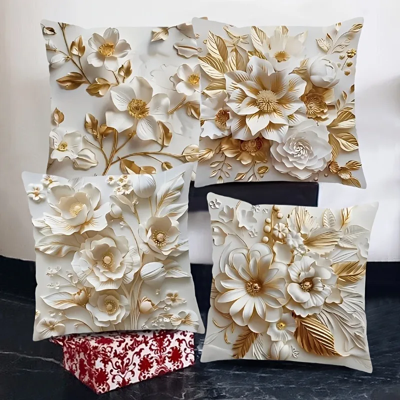 Gold and White Floral Throw Pillow Pattern Home Decorative Pillowcase Living Room Sofa Polyester Cushion Cover with Zipper