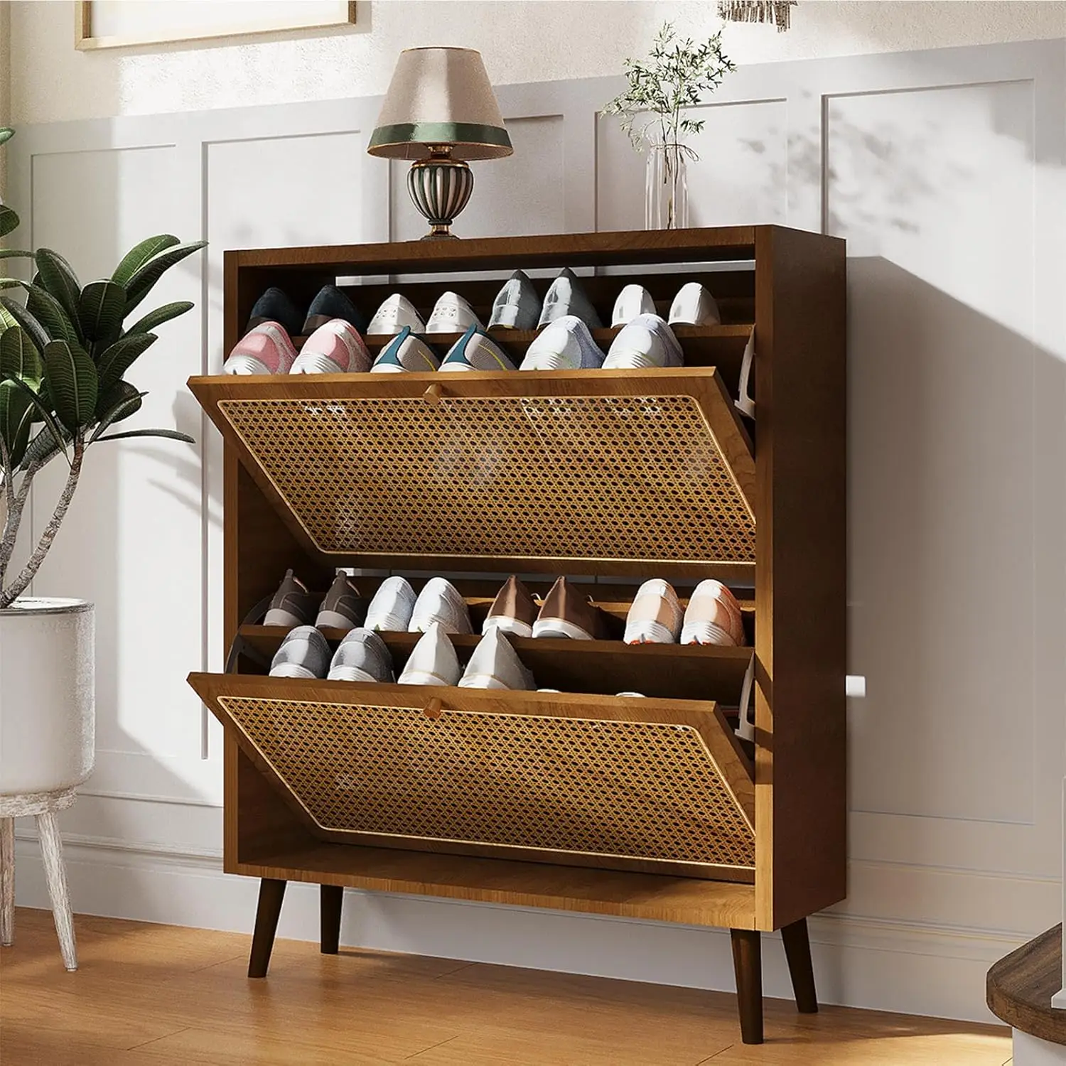 Modern Rattan Shoe Cabinet: Slim 2-Tier Flip Oak Wood Drawer Organizer for Entryway for Apartment and Hallway - with Wooden Legs