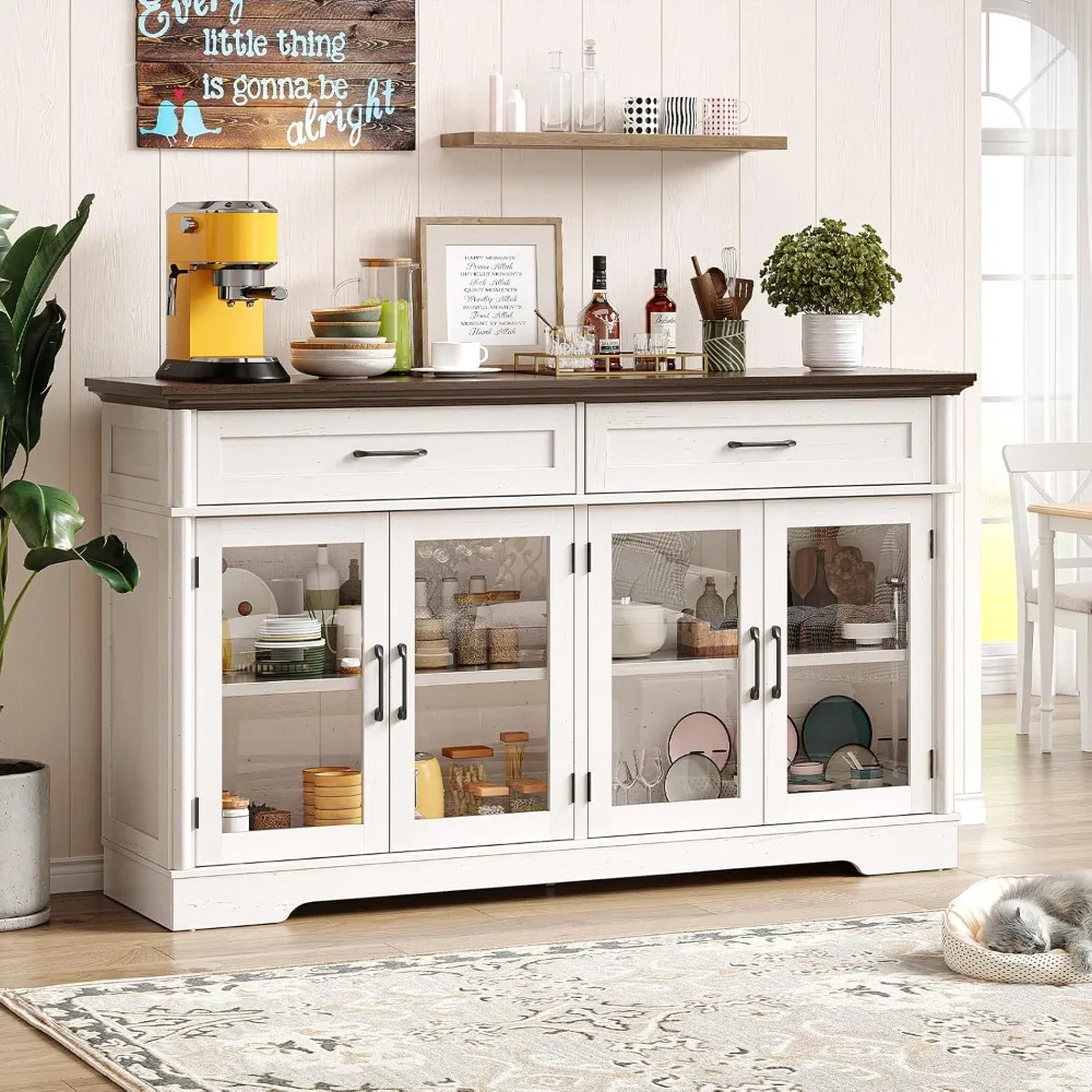 buffet cabinet with storage, 60" sideboard cabinet with 4 glass doors and 2 drawers, modern storage console with adjustable shel