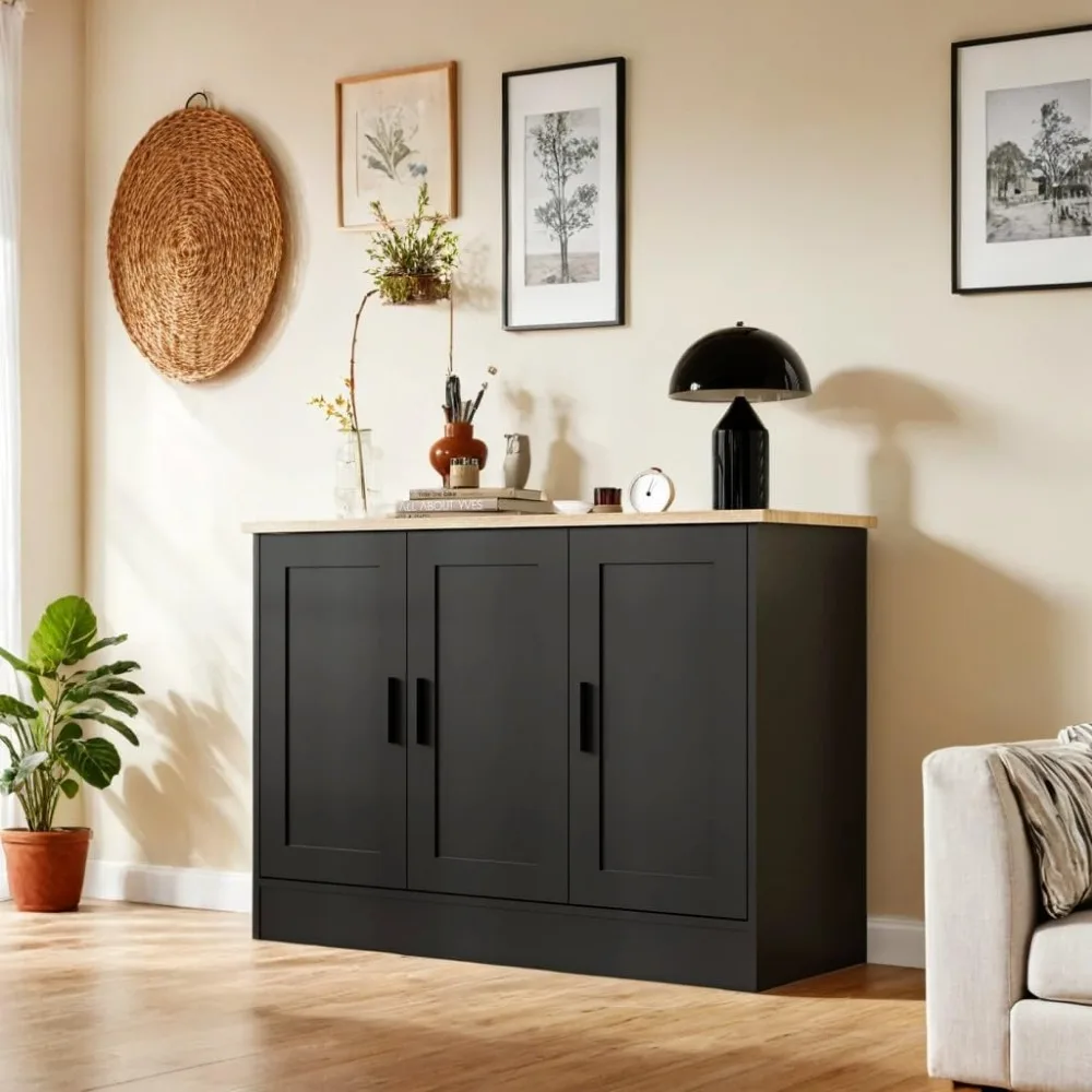 Black 3 Door Buffet Cabinet 43.3”W with Adjustable Shelf Coffee Bar Kitchen Sideboard for Living Room