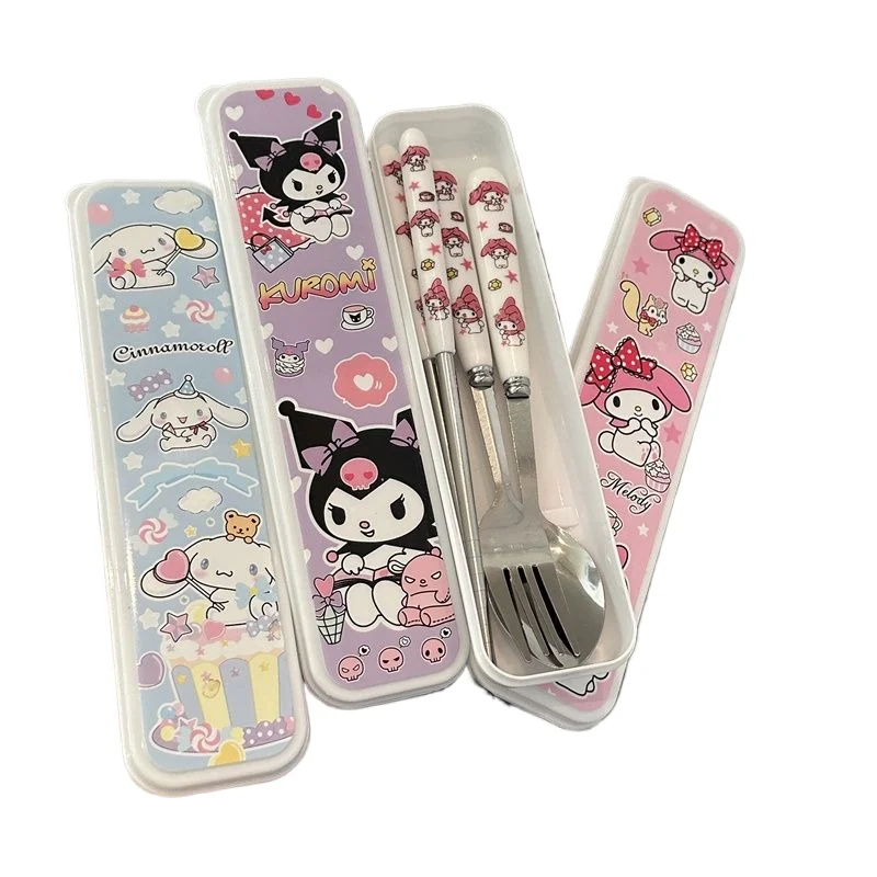 Sanrio tableware cartoon cute portable boxed spoon fork chopsticks stainless steel set children's tableware wholesale  Read more