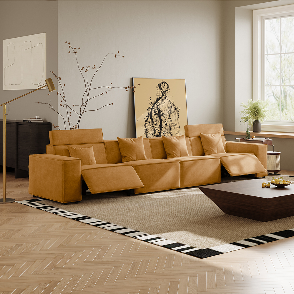 145.28"Minimalist Power Reclining Sofa, 4 Recliners, Anti-scratch Fabric, Living Room, Orange