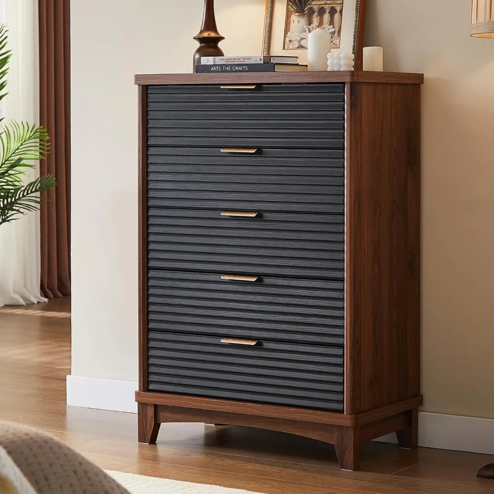 "Elegant Slanted Louver Wood Tall 5-Drawer Dresser with Retro Style and Built-in Charging Station for Bedrooms"  Read more