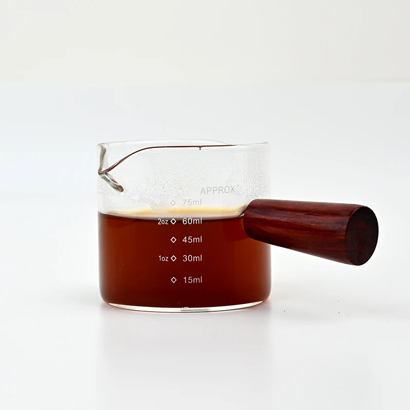 1pc Glass Measuring Cup Wood Handle Glass Espresso Measuring Cup Double Single Mouth Milk Coffee Clear Mug Coffee Supplies