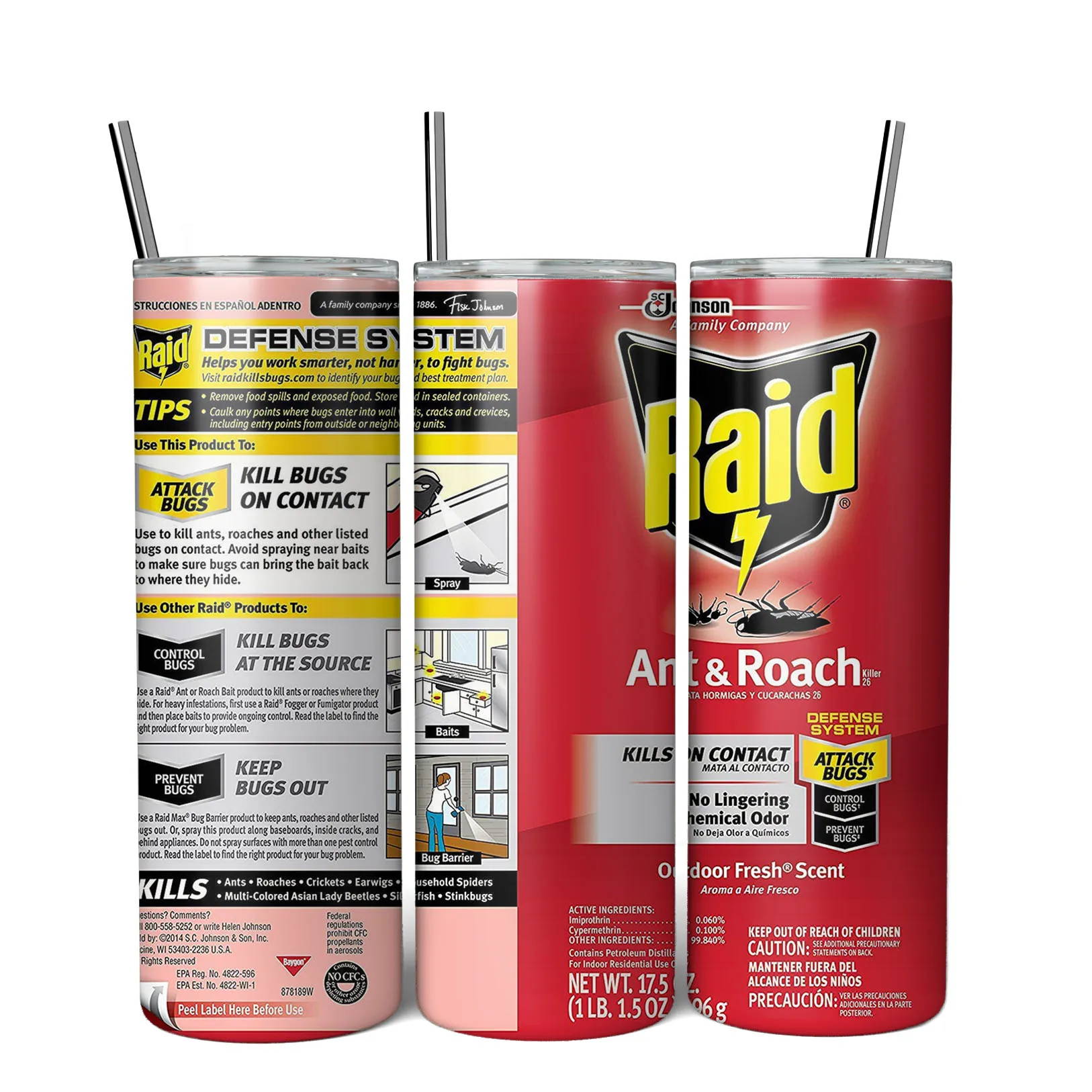 20oz Funny Raid Bug Spray Can Tumbler | Stainless Steel Insulated Travel Mug with Straw - Novelty Insecticide Design Cup
