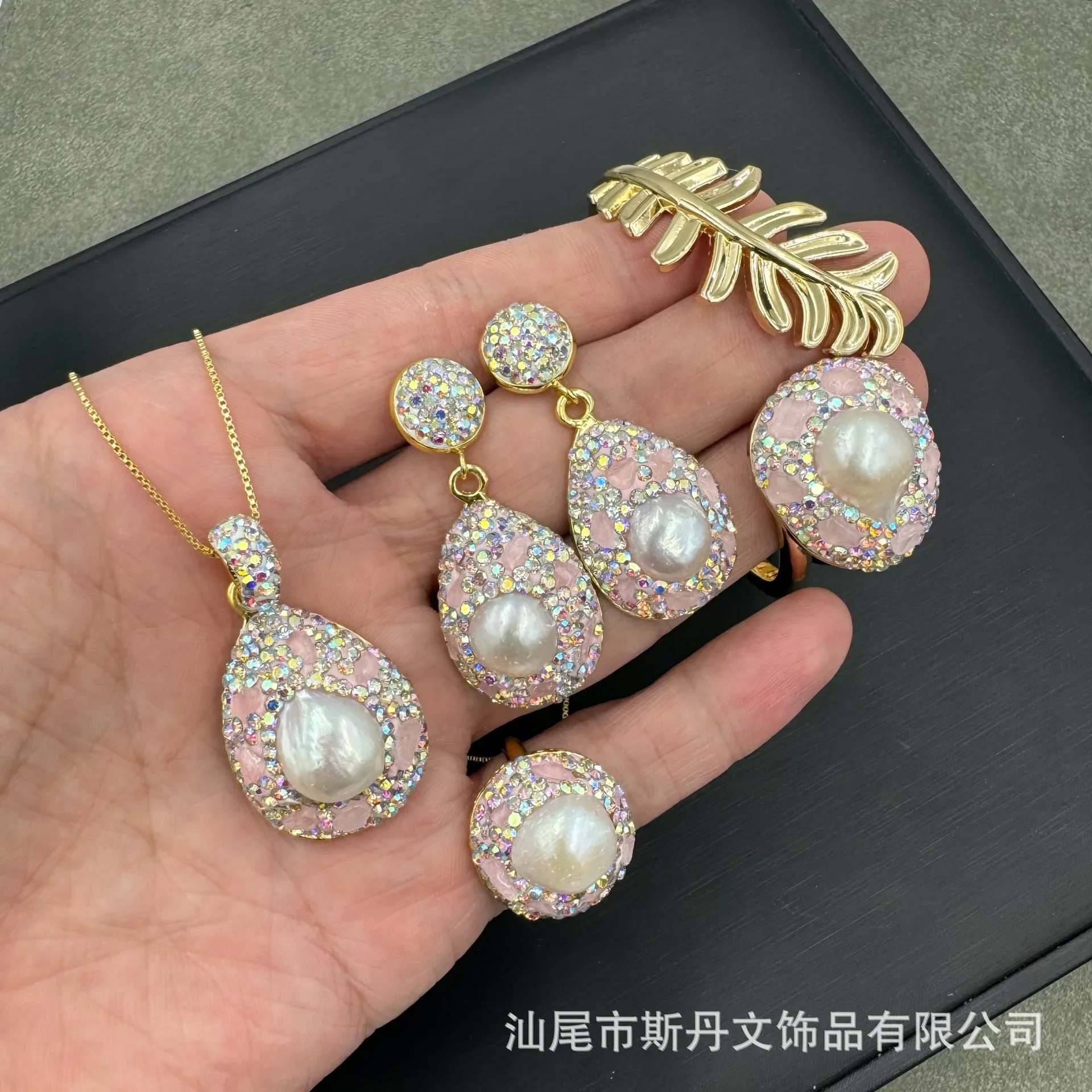 New Baroque pearl powder crystal rough stone inlay set, personalized fashion light luxury factory supply wholesale four-piece se