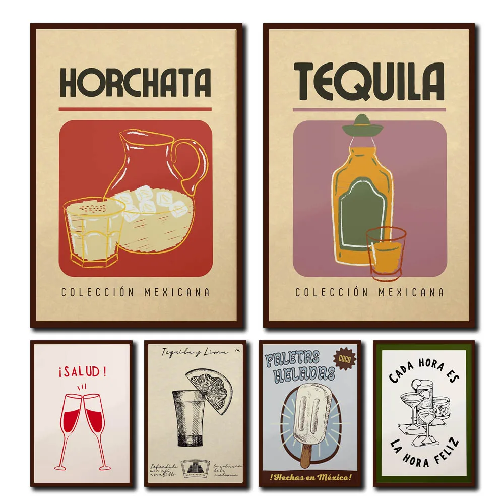 Mexican Art Poster Drinks and Ice Cream Tequila Minimalist Vintage Wall Decoration Canvas Print Home Bar Decoration Perfect Gift