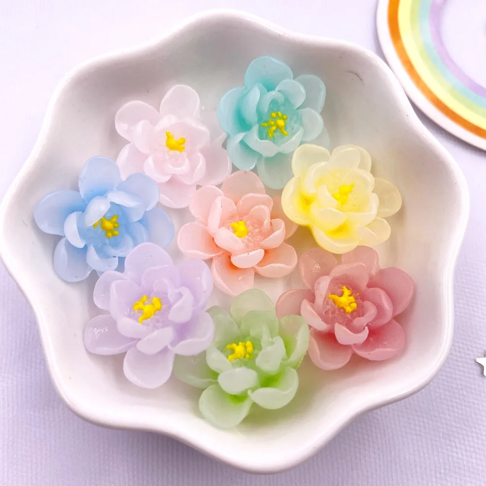 22mm Resin Gradient Colorful Luminous Big Lotus Flatback Flower Rhinestone Figurines Scrapbook Ornament 10Pcs DIY Bow Craft OL7