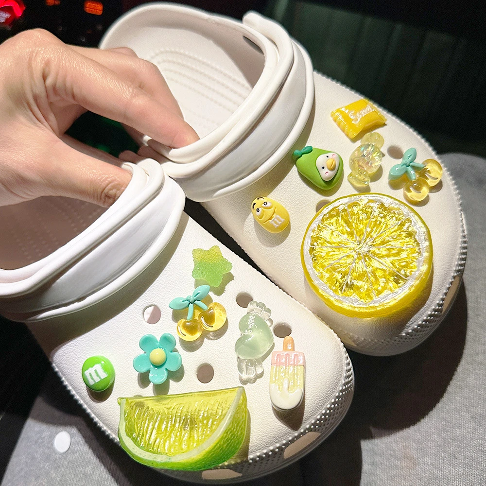 13pcs Whole Set DIY 3D Fruit Crystal Cyan Lemon Hole Shoe Charms Designer Quality Garden Shoe Decoration Accessories Girl Gift  Read more