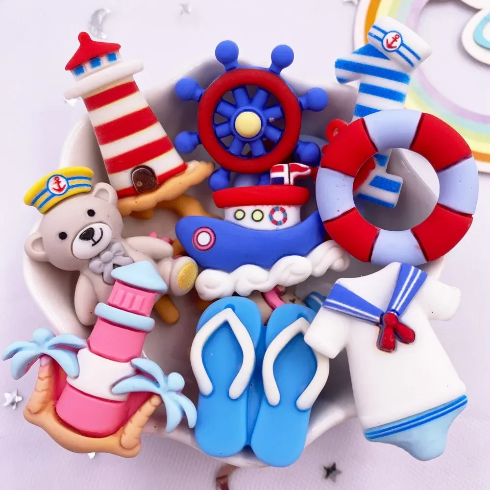 Resin Kawaii Colorful Cartoon Tower Ship Swimming Circle Cat Flatback Stone Sandy Beach Figurine 10PCS Scrapbook DIY Decor Craft