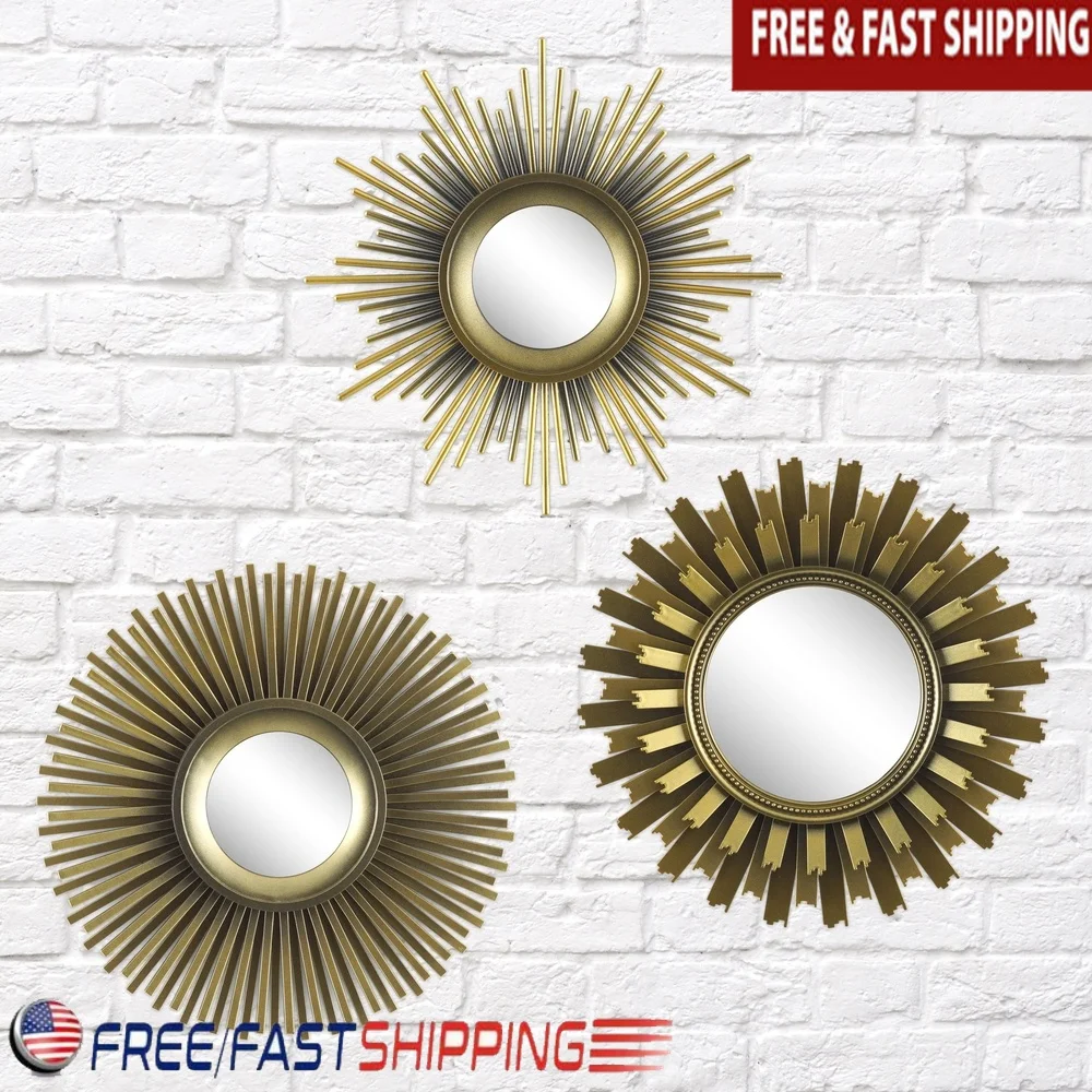 Round Sunburst Mirror Set of 3 Decorative Wall Mirrors Mid-Century Modern Chic Lightweight Gold Frame Indoor Home Decor