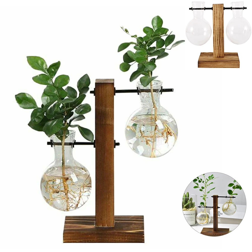 Glass Bulb Vase Desktop Hydroponic Plant Terrarium Vasevase Wooden Stand Plant Container Home Office Coffee Shop Decor Vases