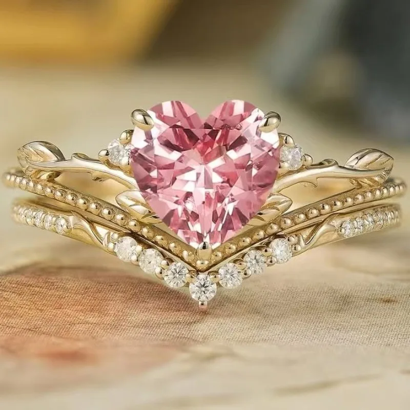 European and American new fashion crown shape pink heart-shaped zircon inlaid personalized luxury court style women's ring