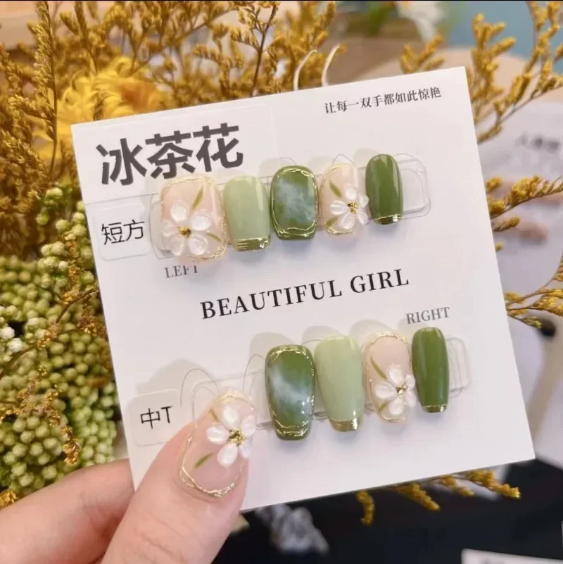 10pcs Handmade Green Flower Medium Coffin Press on Nails Set High Quality Cute Fake Nails with Glue Korean Acrylic False Nails