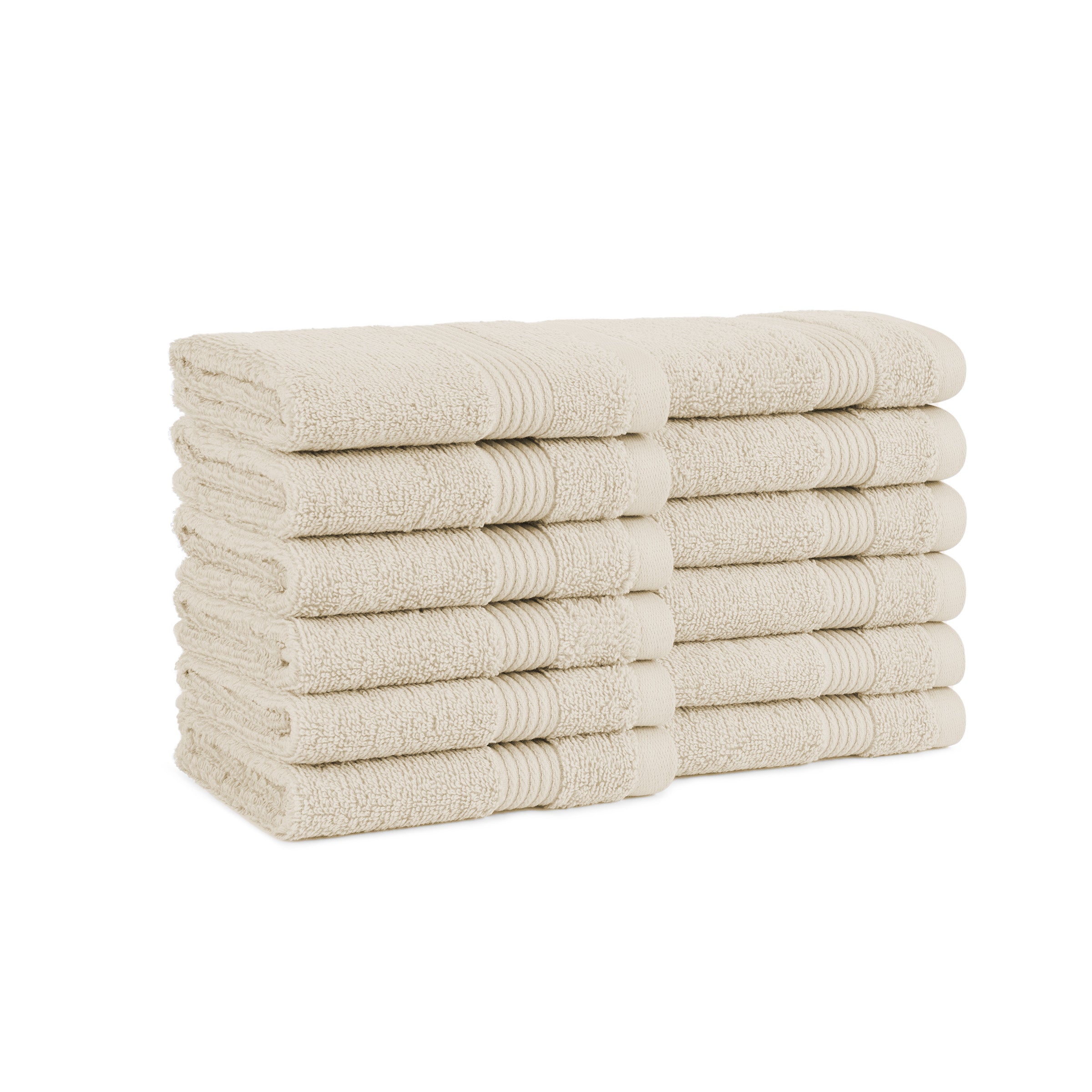 This quality line of 13x13 in. washcloths for the bathroom are available in six colors and are made from premium soft 100% ringspun cotton. These wash cloths are decorated with a stylish raised matching stripe dobby border and come in a bulk pack of...