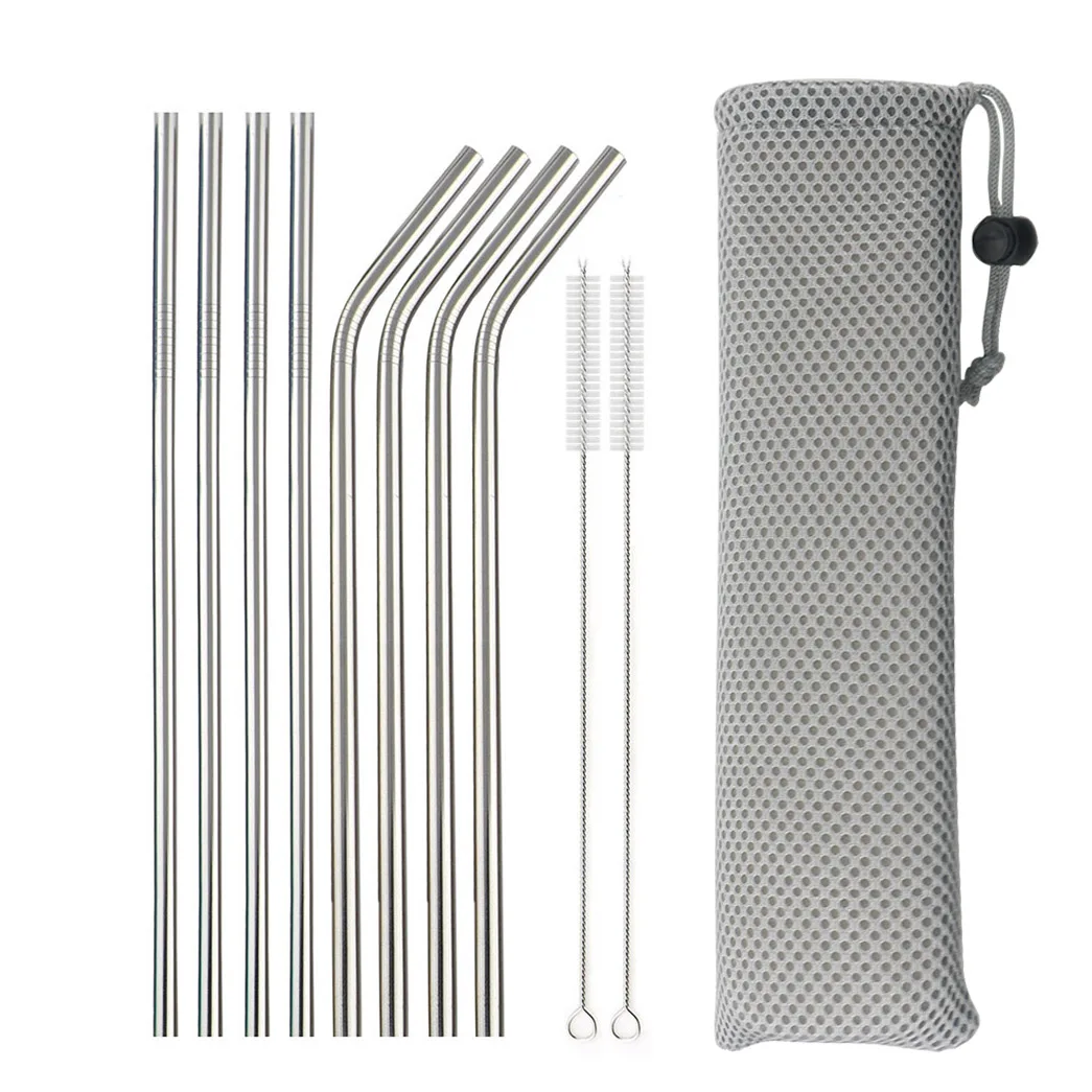 Reusable Drinking Straw 304 Stainless Steel Straws Straight Bent Metal Straw with Cleaner Brush Pouch Wholesale