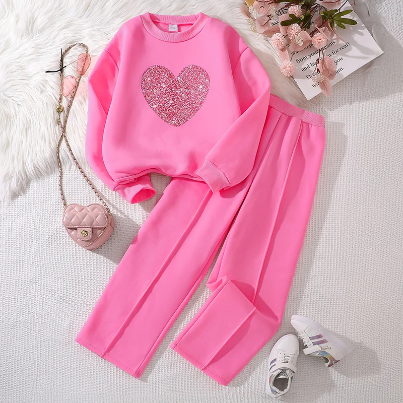 Children‘s Autumn Winter Warm Clothes Sets For Girls Solid Color Heart Print Top And Pants Daily Causal Sports Loose Lounge Wear