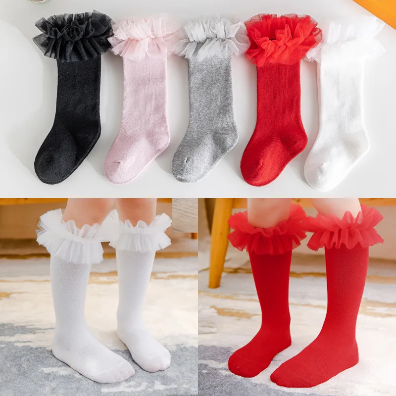 Autumn Winter Baby Girls Socks Toddlers Children Knee High Socks Soft Cotton Puffy Mesh Lace Flower Kids Sock Tube Calcetines