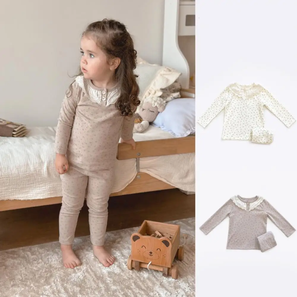 Round Neck Long Sleeved Floral Print Girls Pajamas Two-Piece Set Children Casual Comfort Home Wear Sets Girl Lace Clothes