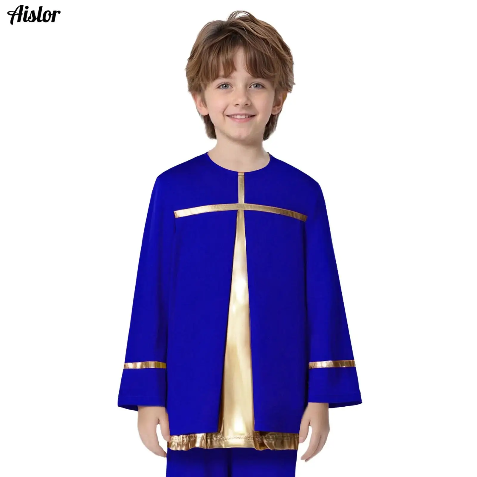 Kids Boys Girls Liturgical Praise Dance Top Round Neck Long Sleeve Metallic Shiny Color Block Blouses Top Choir Church Dancewear