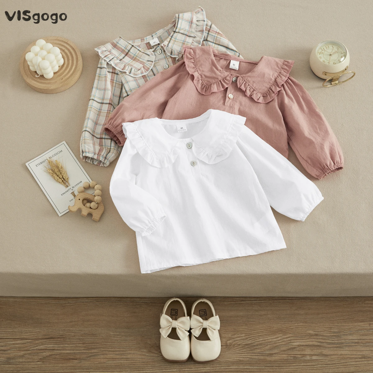 VISgogo Toddler Kids Girls Sweet Blouses Plaid/Solid Color Doll Collar Long Sleeve Shirts Spring Autumn Fashion Casual Tops