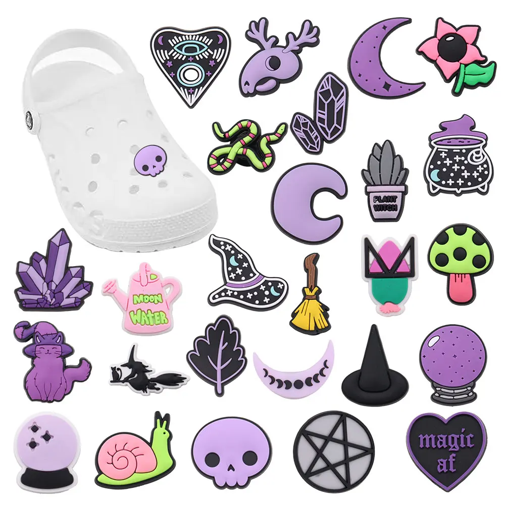 Sell Retail 1pcs PVC Shoe Charms Magic Purple Moon Crystal Cat Skull Witch Accessories Shoes Buckles For Kids Party Present