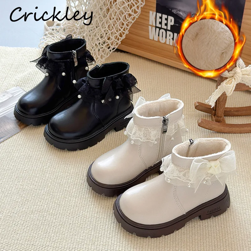 Winter Lace Ruffles Bow Kids Fashion Boots Short Warm Girls Princess Ankle Shoes Solid PU Zip Non Slip Children Boots