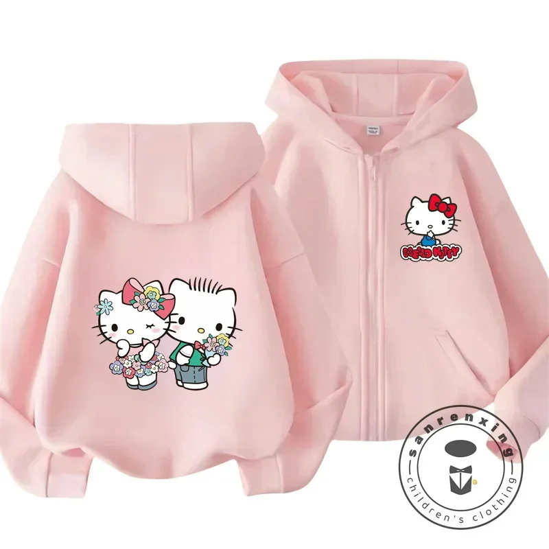 Sanrio Kawaii Cute Girls Hello Kitty Hoodie Set Autumn Top + Pants Kids 3 14 Years Old Party Casual Sports Zipper Cardigan