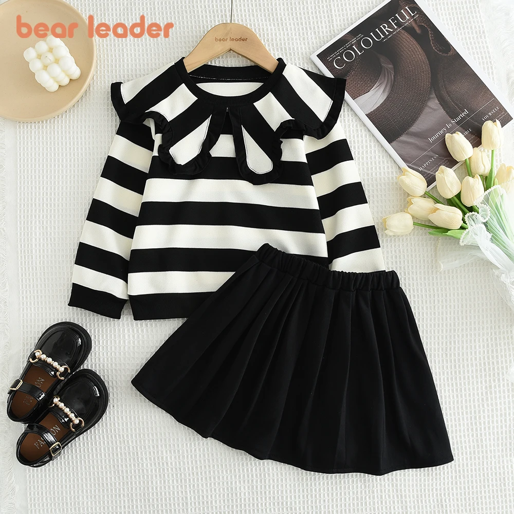 Bear Leader Children's Set Autumn Girl's Clothing Black and White Striped Long Sleeved Top+black Pleated Skirt 2-piece Sets  Read more