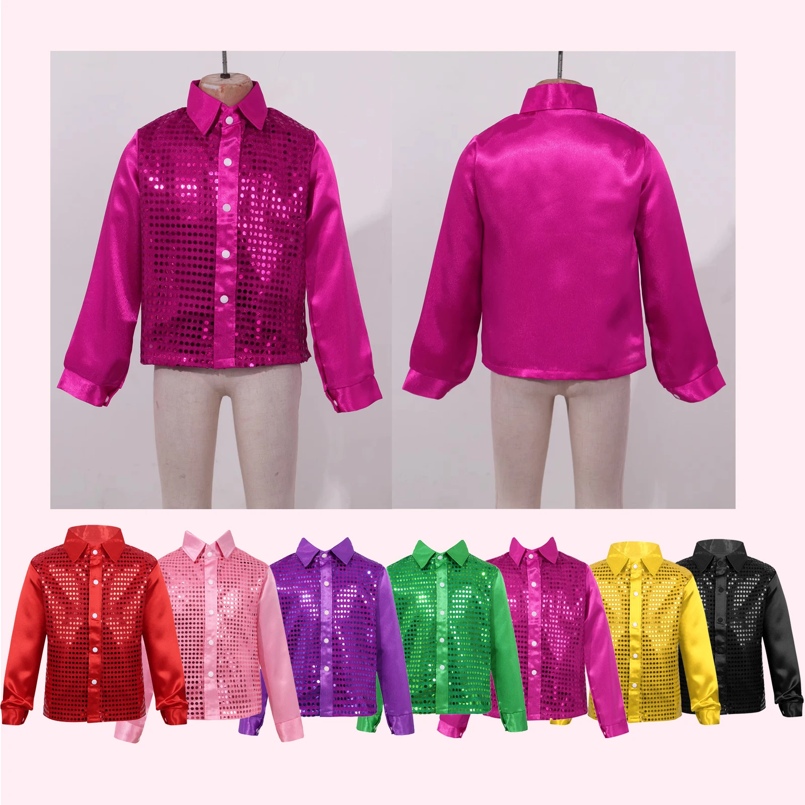 Kids Boys Shiny Sequins Shirts Dance Costumes Long Sleeve Lapel Hip-hop Jazz Dance Shirt Stage Performance Street Dance Wear