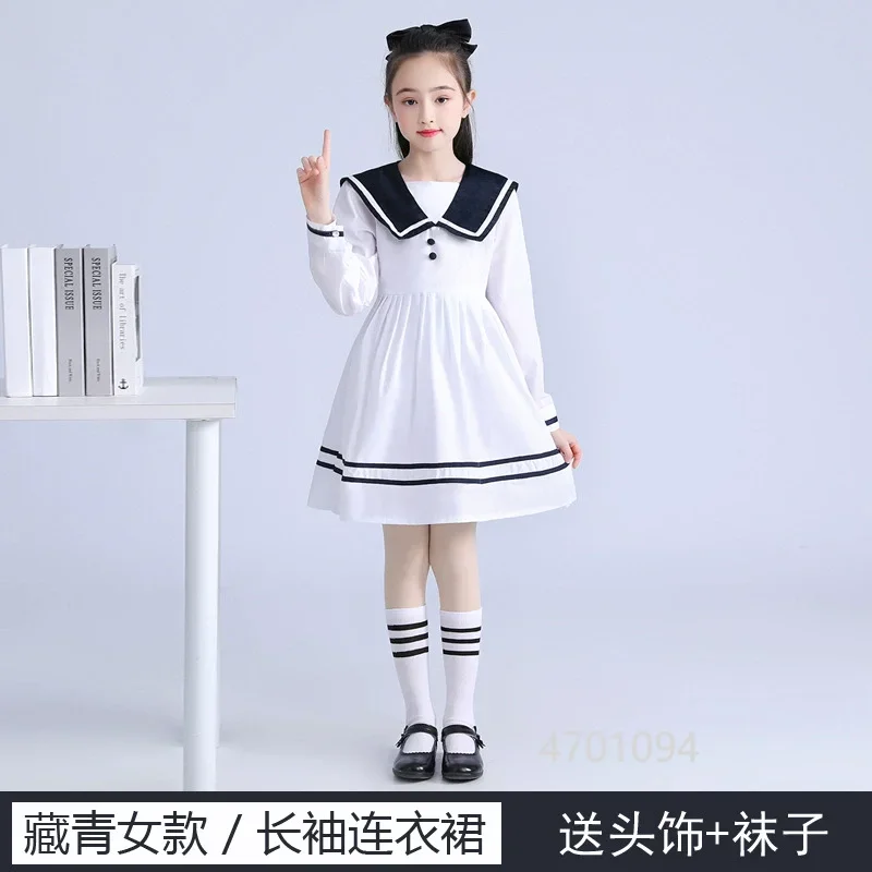 2025 Spring New retro Girls long Cotton Sailor Collar Teens striped JK Dress Baby Clothes Toddler 4 8 10 12 year korean PREPPY