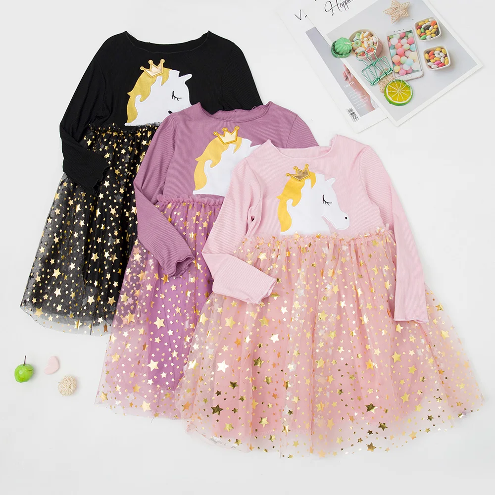 Unicorn Dress Kids Girls Long Sleeve Stars Sequin Princess Tulle Dress For toddler Birthday Party Bridesmaid Wedding Casual Wear