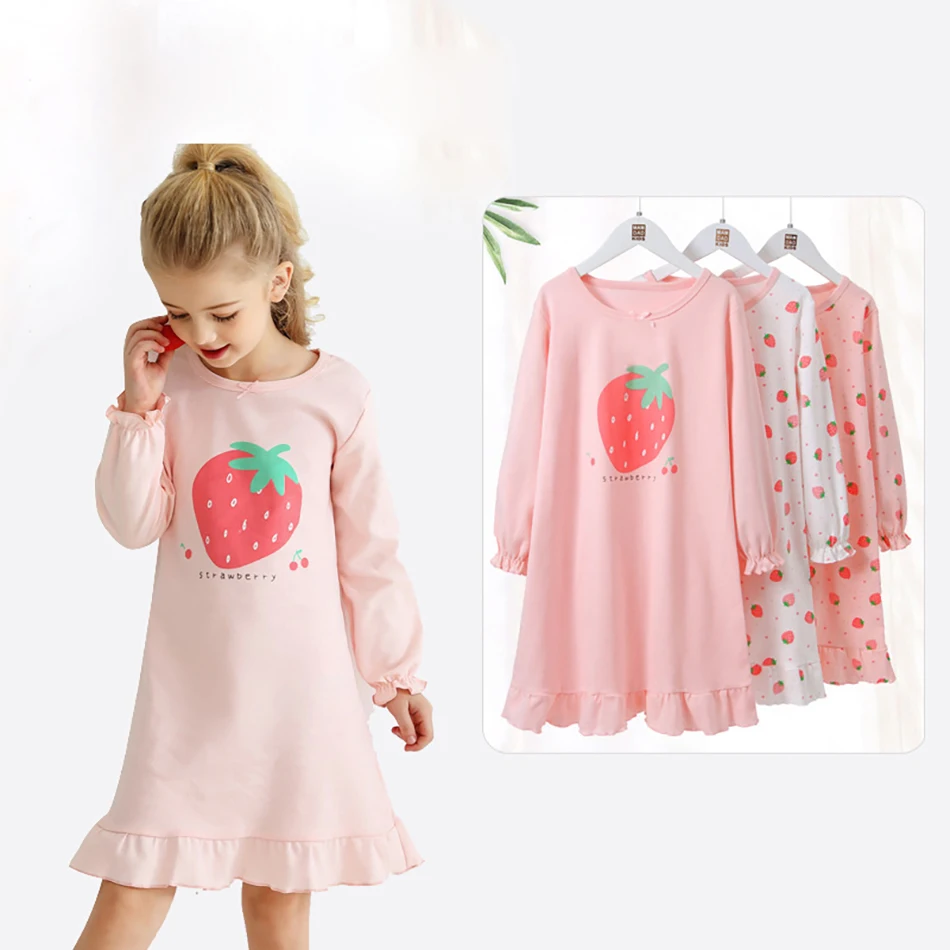 Children Cotton Nightwear Girls Long Sleeve Dress Kids Strawberry Print Casual Soft Comfortable Homewear Sleep Dress Nightgowns