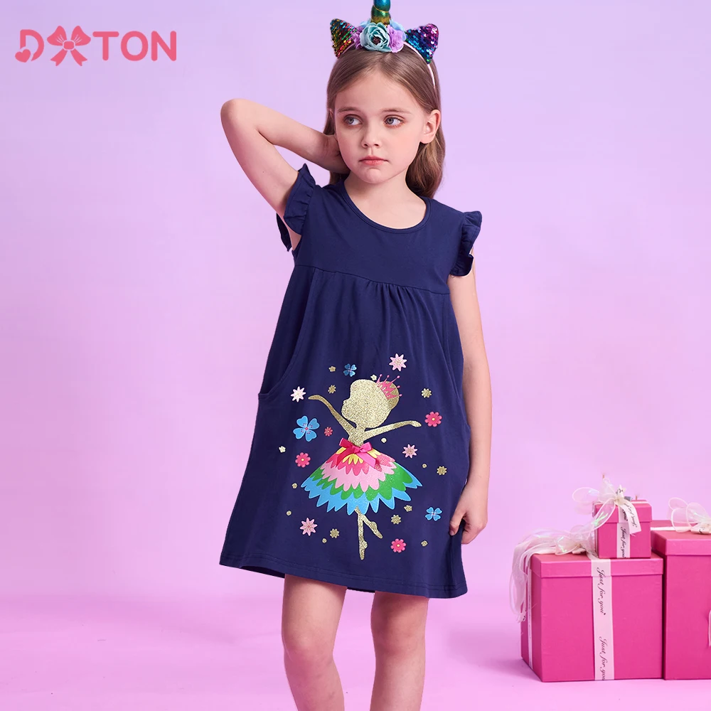 DXTON Kids Casual Dresses Ruffled Sleeveless Cotton Children's Vestidos Floral Elf Printed Girls Straight Dresses with Pockets