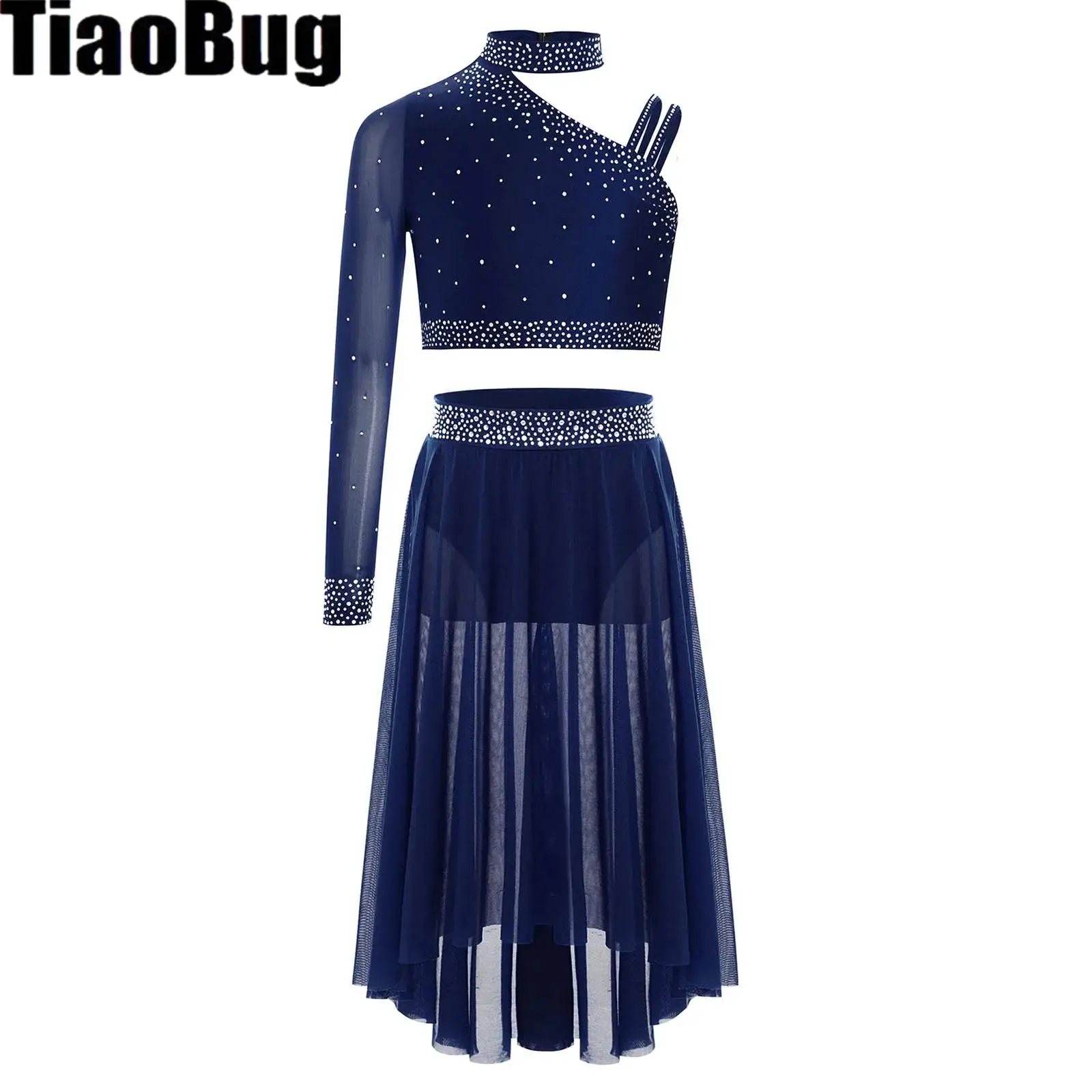 Girls Lyrical Dance Set Rhinestones Tops One Shoulder Crop Top with Side Slit Irregular Mesh Skirt Modern Contemporary Dancewear