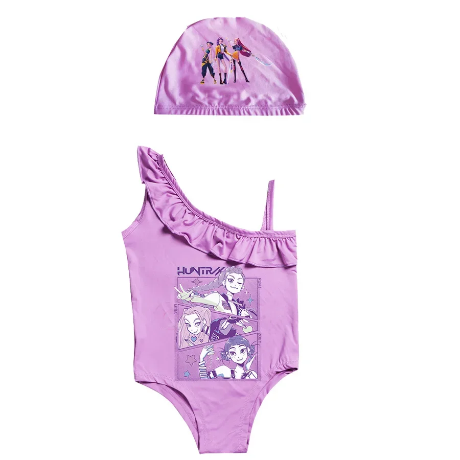 NEW Swimsuit Kids KPop Demon Hunters Huntrix Sleeveless One Piece Swimwear Girls Ruffles Bathing Suit Children's BodySuit