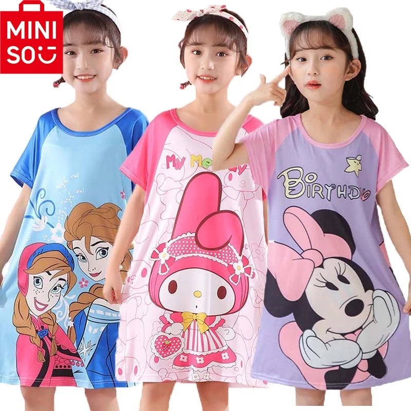 MINISO Girls Night Dress Pink Blue Summer Disney Cute Minnie Frozen Princess Elsa Sanrio Print Toddler Girl Nightgown for Teens