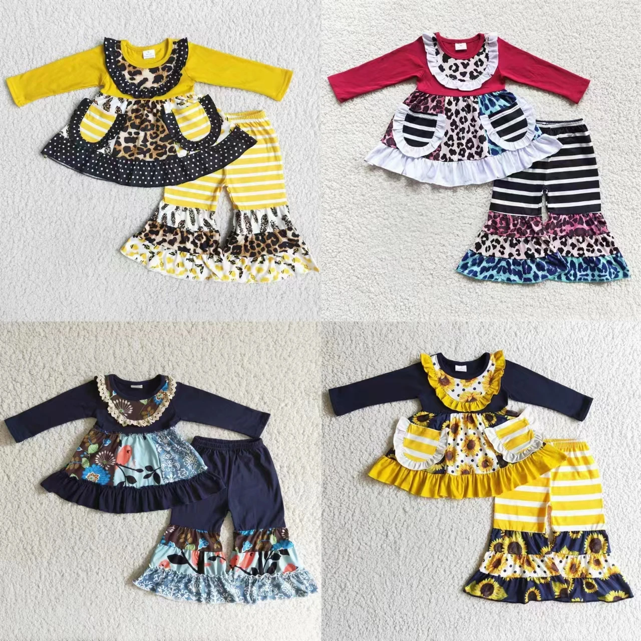 Promotion Baby Girl Leopard Floral Outfit Long Sleeves Pocket Tunic Children Kids Bell Pants Wholesale Toddler Cotton Ruffle Set