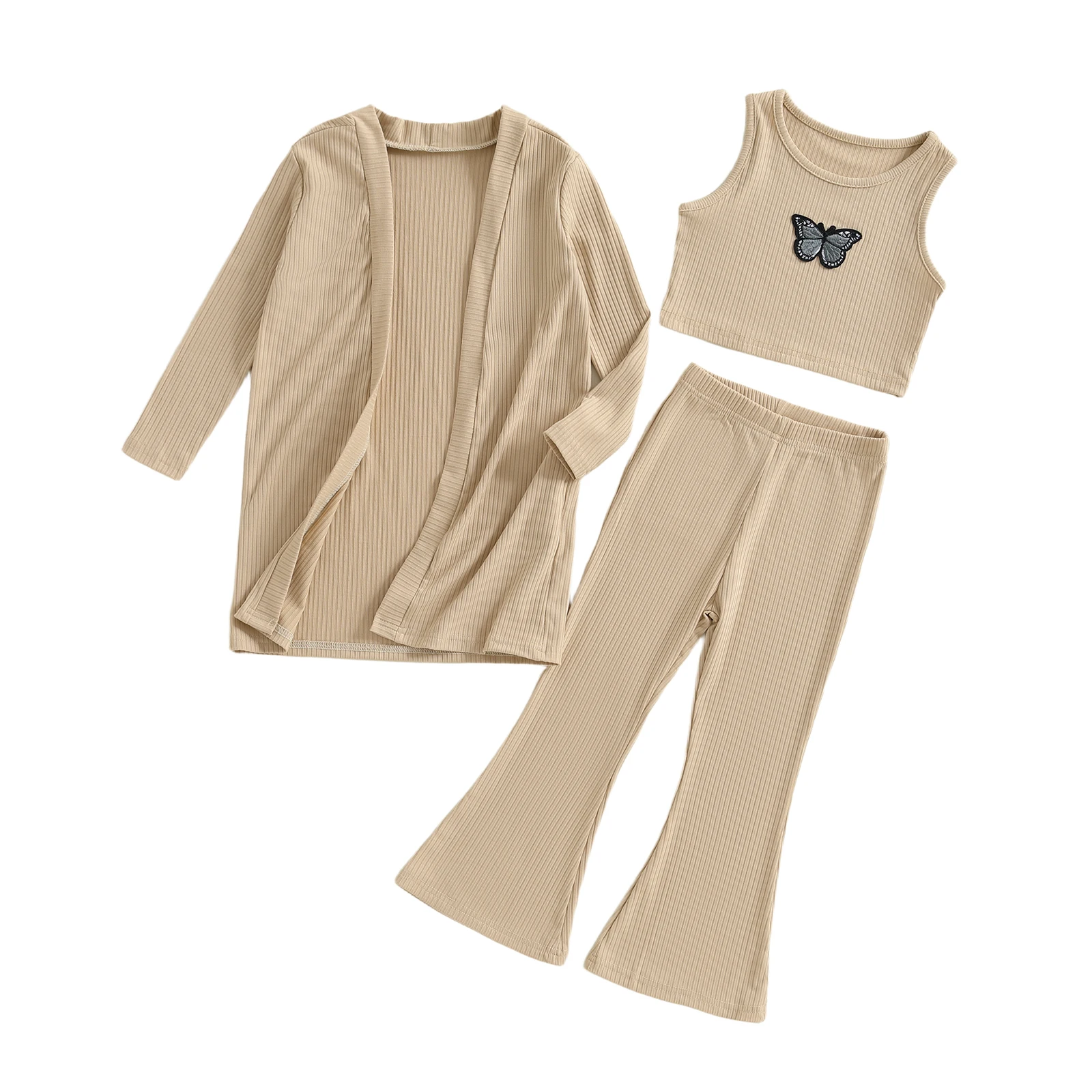 3-10Y Little Toddler Girl Knitted Outfit Butterfly Ribbed Tank Tops Slightly Flared Pants and Long Cardigan 3 Pcs Sets