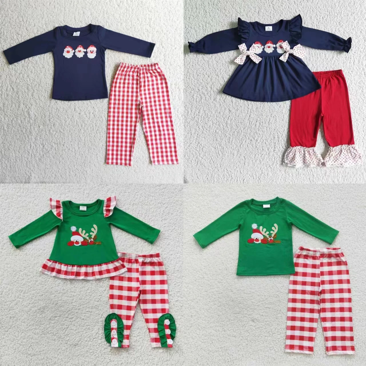 Wholesale Children Embroidery Sets Long Sleeves Tops Pants Boy Girl Plaid Sleepwear Pajamas Kids Toddler Christmas Santa Outfit