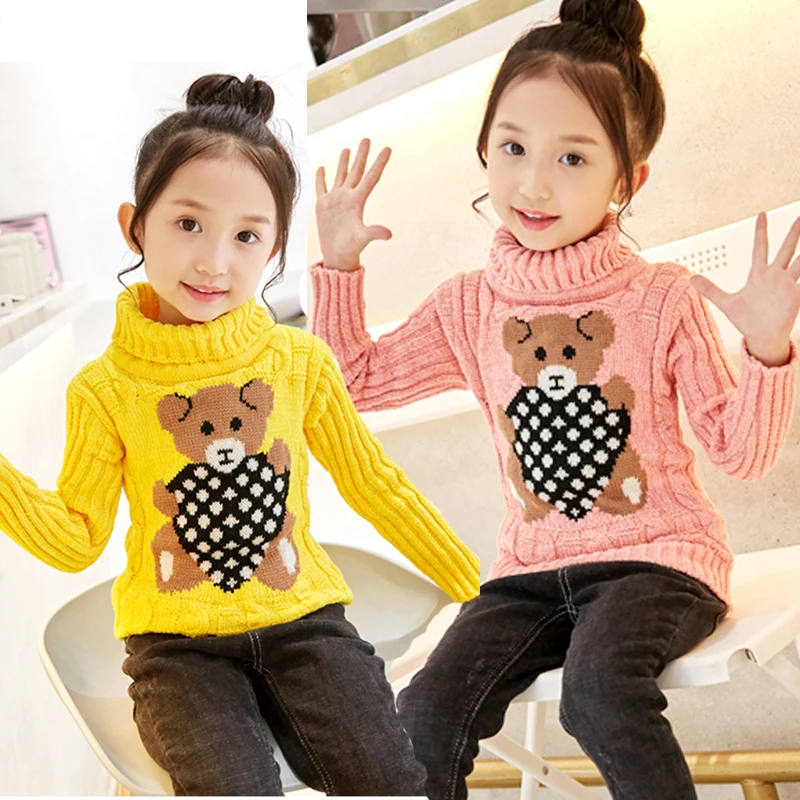 New Winter Keep Warm Girls Sweater Cartoon Bear Pattern High Neck Design Full Sleeve Knitted Shirt Children Birthday Present