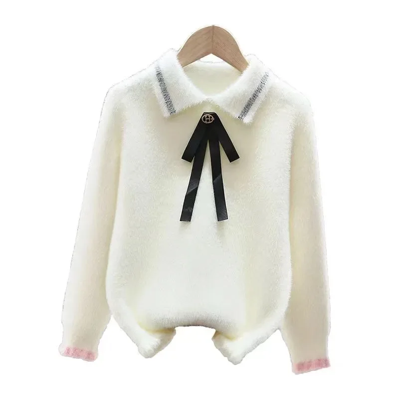 4-14yrs Winter Girls Sweater Pullovers Warm Teens Kids Clothes Knitted Mink sweaters bow princess children clothing Knitwear
