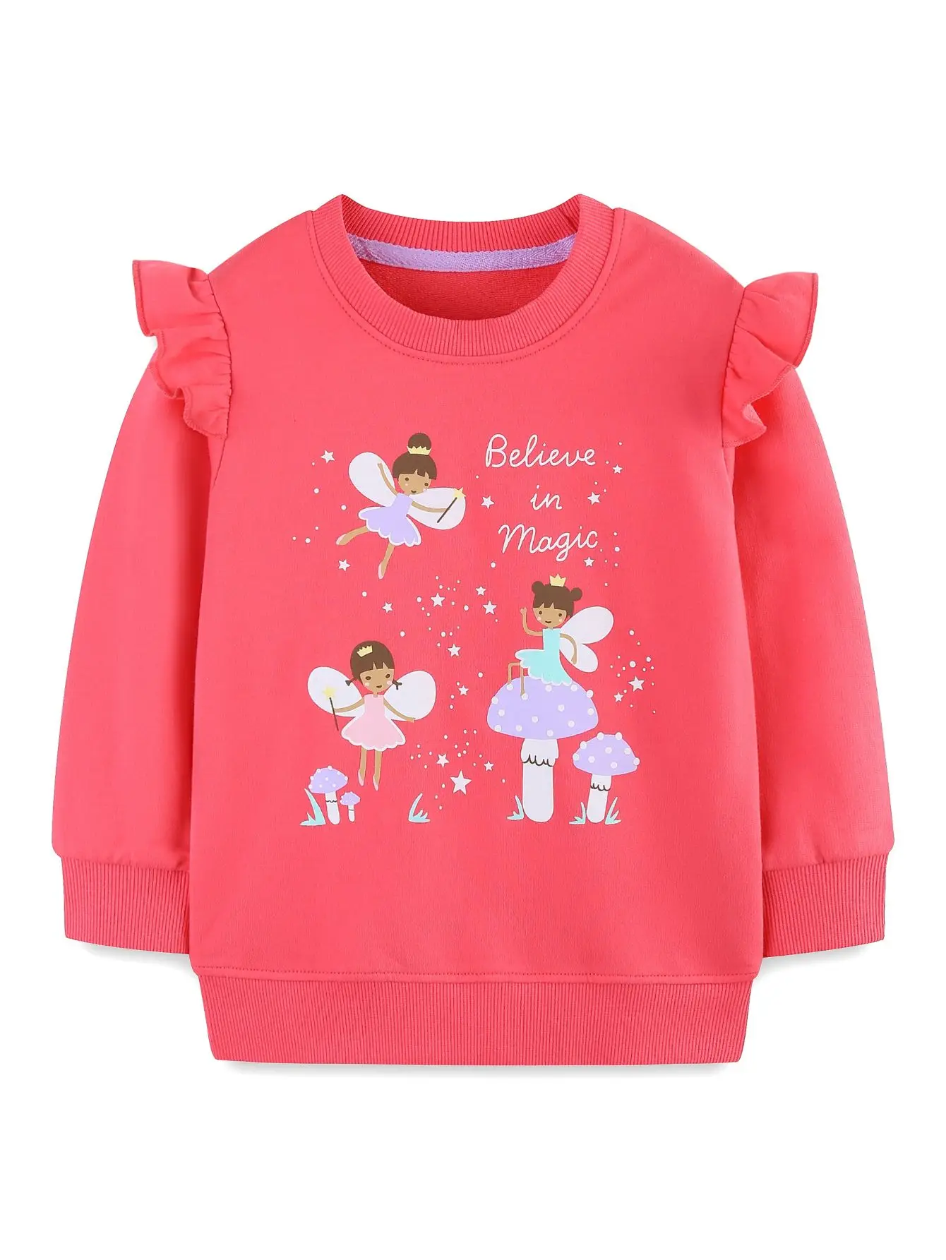 Girls' 100% Cotton Flutter-Sleeve Hoodie with Randomly Printed Little Flower Fairies & Letters - For Spring & Autumn