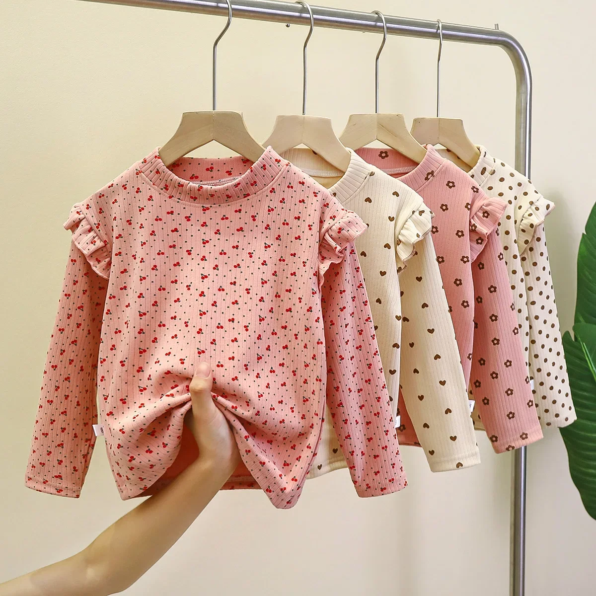 New 2024 Autumn Winter Kids Long Sleeve Round Neck Cartoon Floral Heart T-shirt Tops Baby Girls Casual Bottoming Shirt Clothing