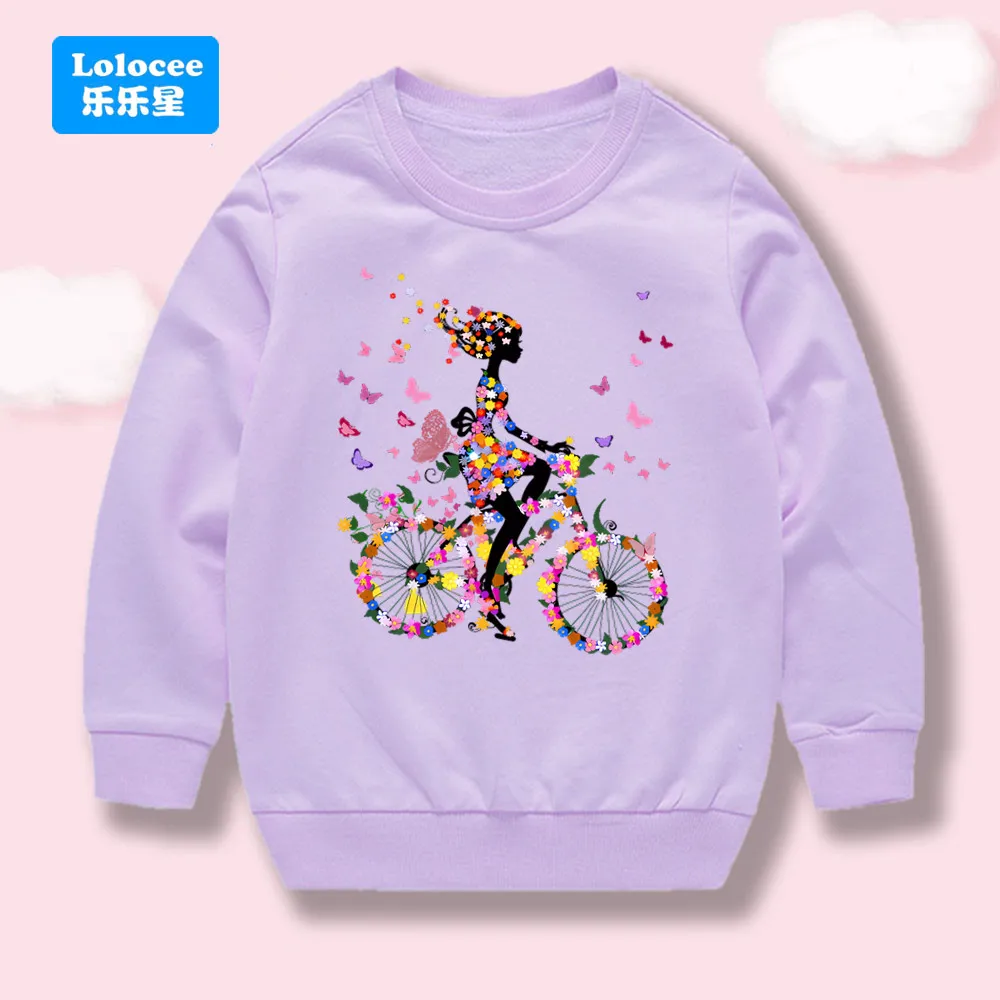 New Fashion Graphic Floral Girl Riding Bike Print Sweatshirt for Kids Clothes Butterfly Print Girls' Crewneck Pullovers DCHD1