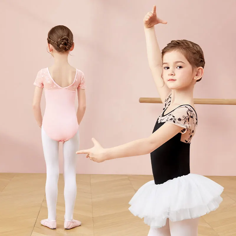 Girls Ballet Leotards Embroidery Splice Dance Leotards Short Sleeves Gymnastics Leotard Kids Cotton Ballet Dancing Bodysuit