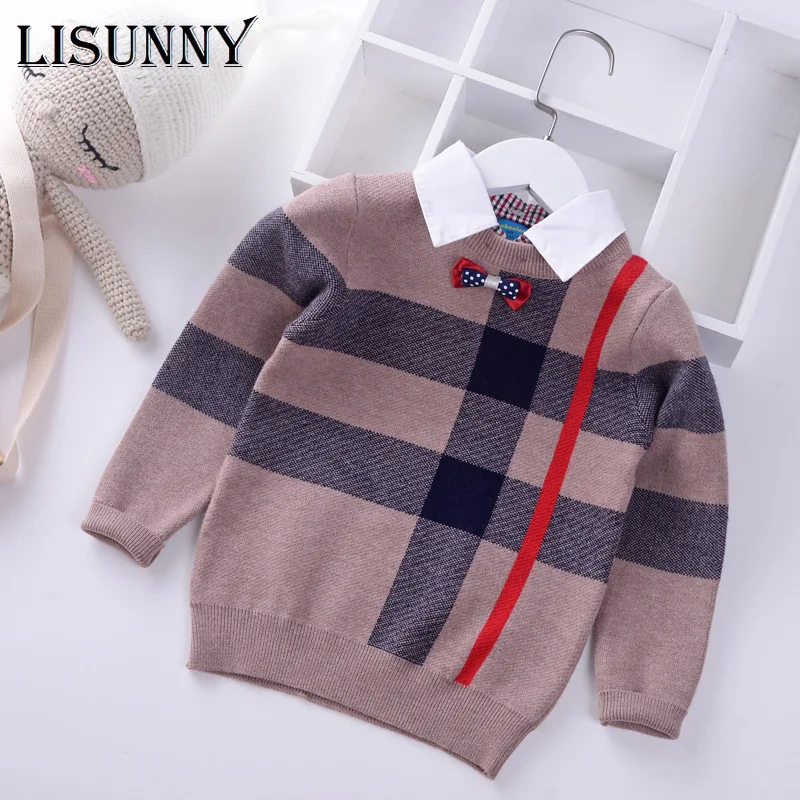 2025 Shirt collar Boys Sweaters Baby stripe Plaid Pullover Knit Kids Clothes Autumn Winter New Children Sweaters Boy Clothing