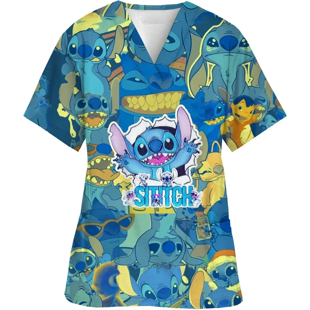 Stitch Nurse Uniform Tops V Neck T Shirt Disney Hospital Woman Clothes Pocket Top Women 2024 Summer T-shirt Shirts T-shirts Tees