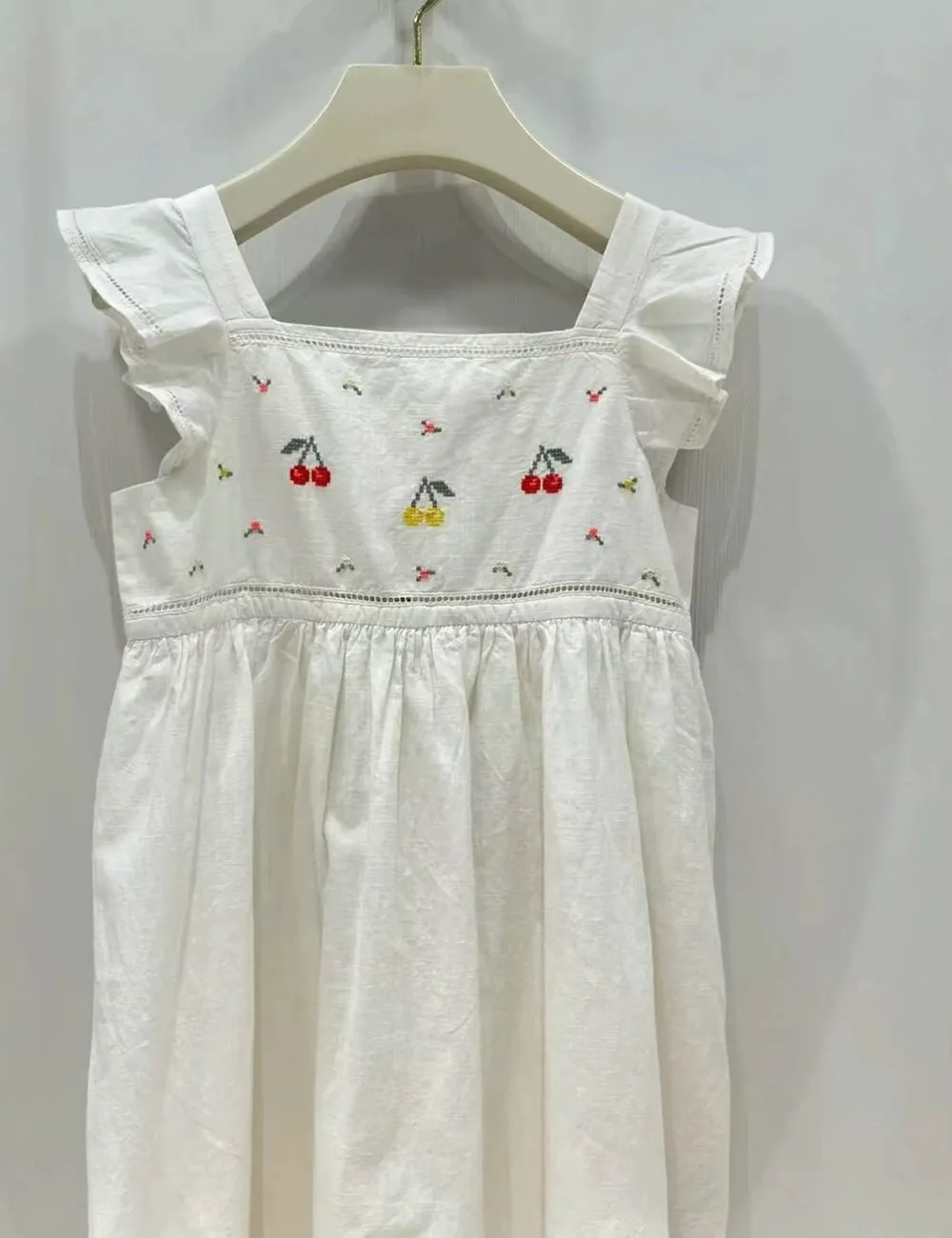 kids girls clothes summer dress baby clothes Cartoon cherry pattern embroidery French style white sleeveless dress