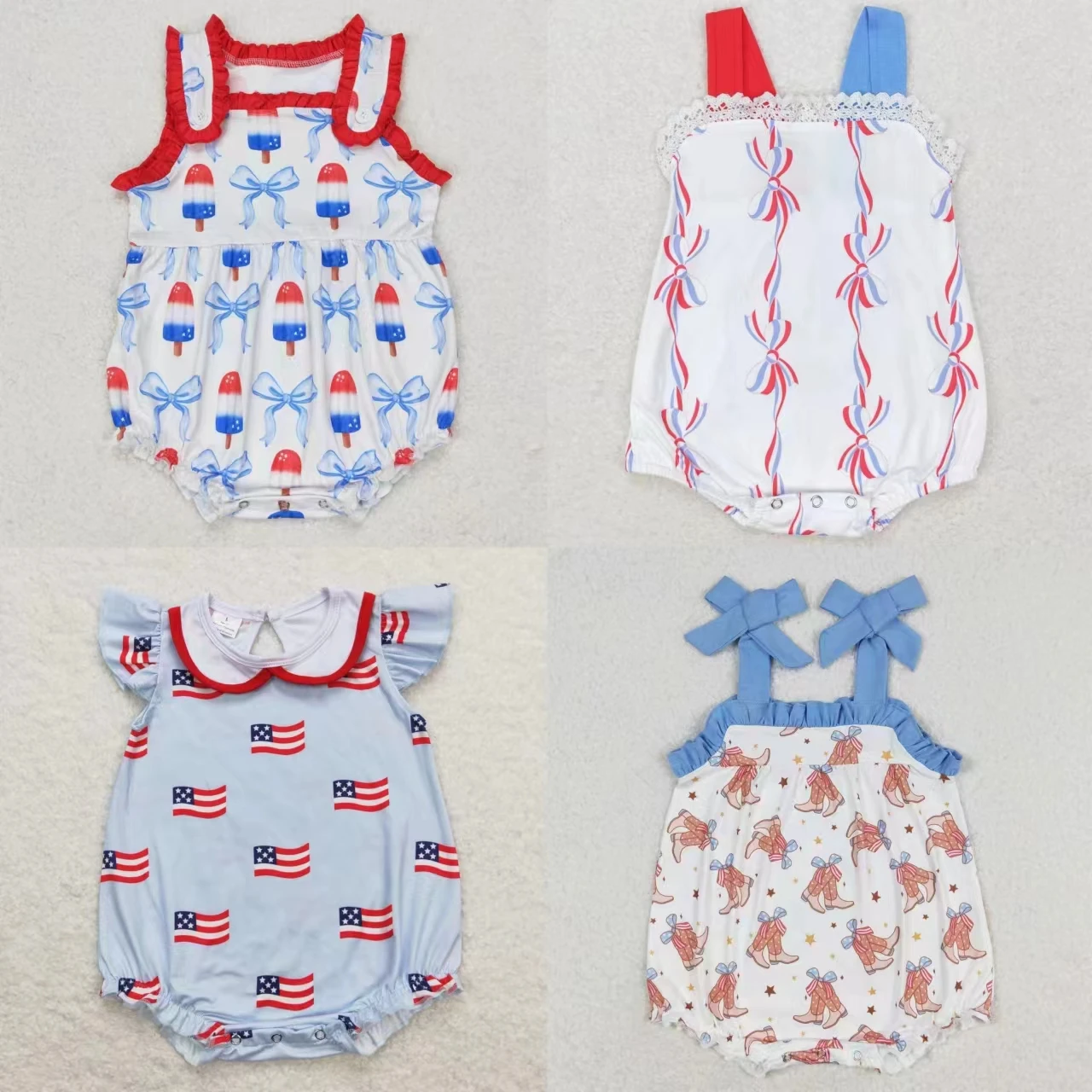 Wholesale Newborn Toddler July 4th Clothing Baby Girl Flags Bows Boots Infant Jumpsuit Kids Children Overall Bubble Romper